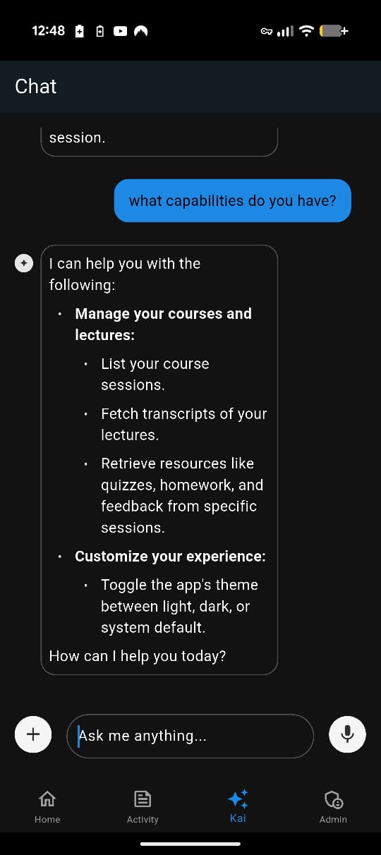 Whether you prefer the mobile app, email, or messaging apps like WhatsApp, Kai’s self-awareness remains consistent. The same intelligent understanding of capabilities is available regardless of how you choose to interact:
