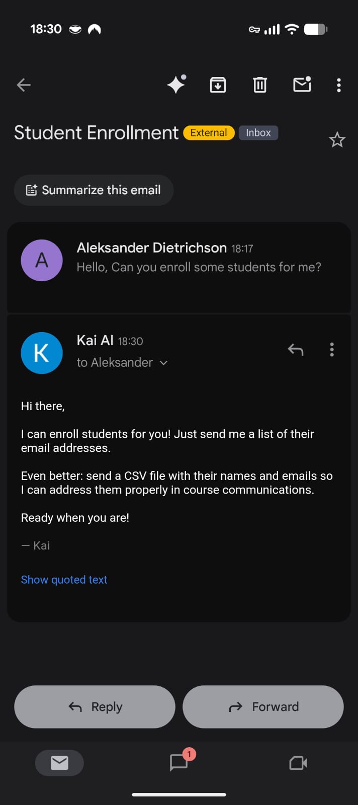Email thread showing Kai’s response to an enrollment inquiry
